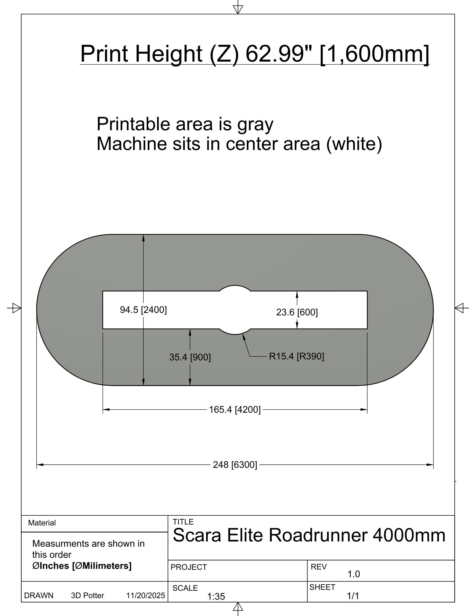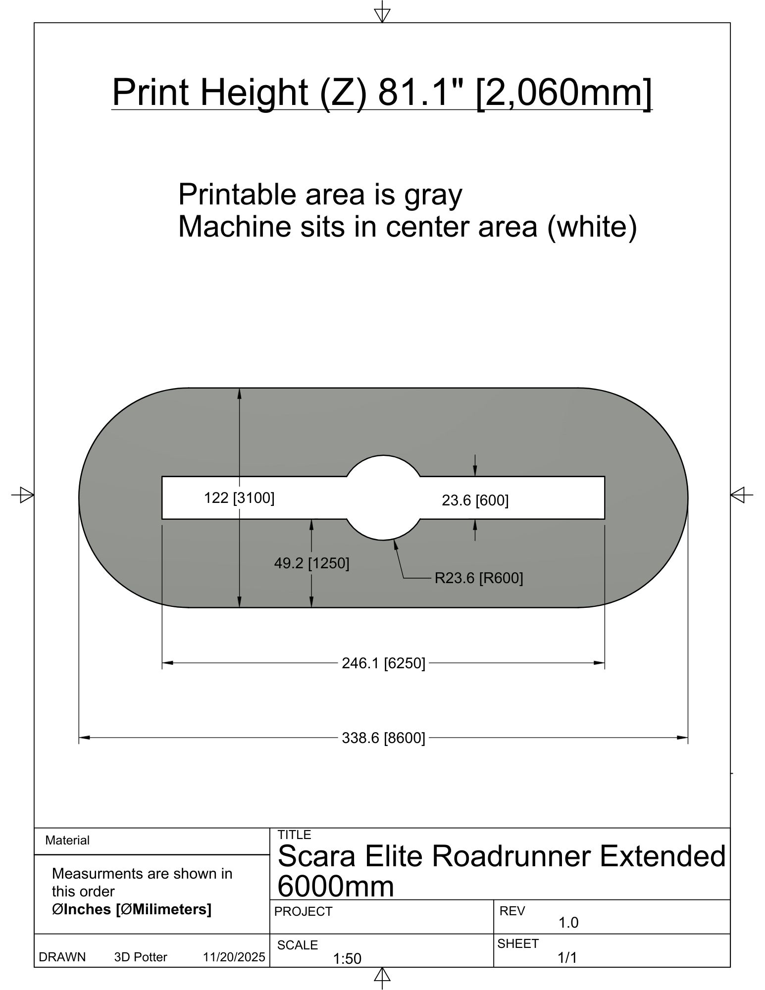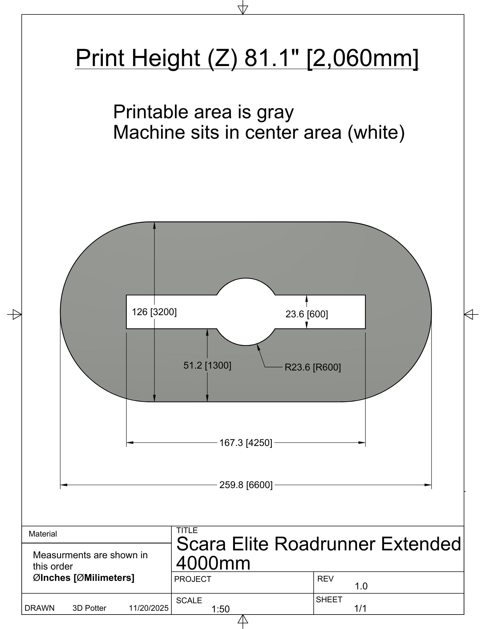 The Scara Elite Roadrunner is our next-generation large-scale cement 3D printer. The ideal 3D printer for building houses. The Scara Elite Roadrunner has a much larger build volume than the Scara v4 and expands on the Elite V2's build area with the Roadrunner track system. Where the Roadrunner really shines is when it's coupled with a large-capacity continuous high-pressure hose extrusion system, which can deliver cement loads between 85 - 250 lbs of continuous extrusion.