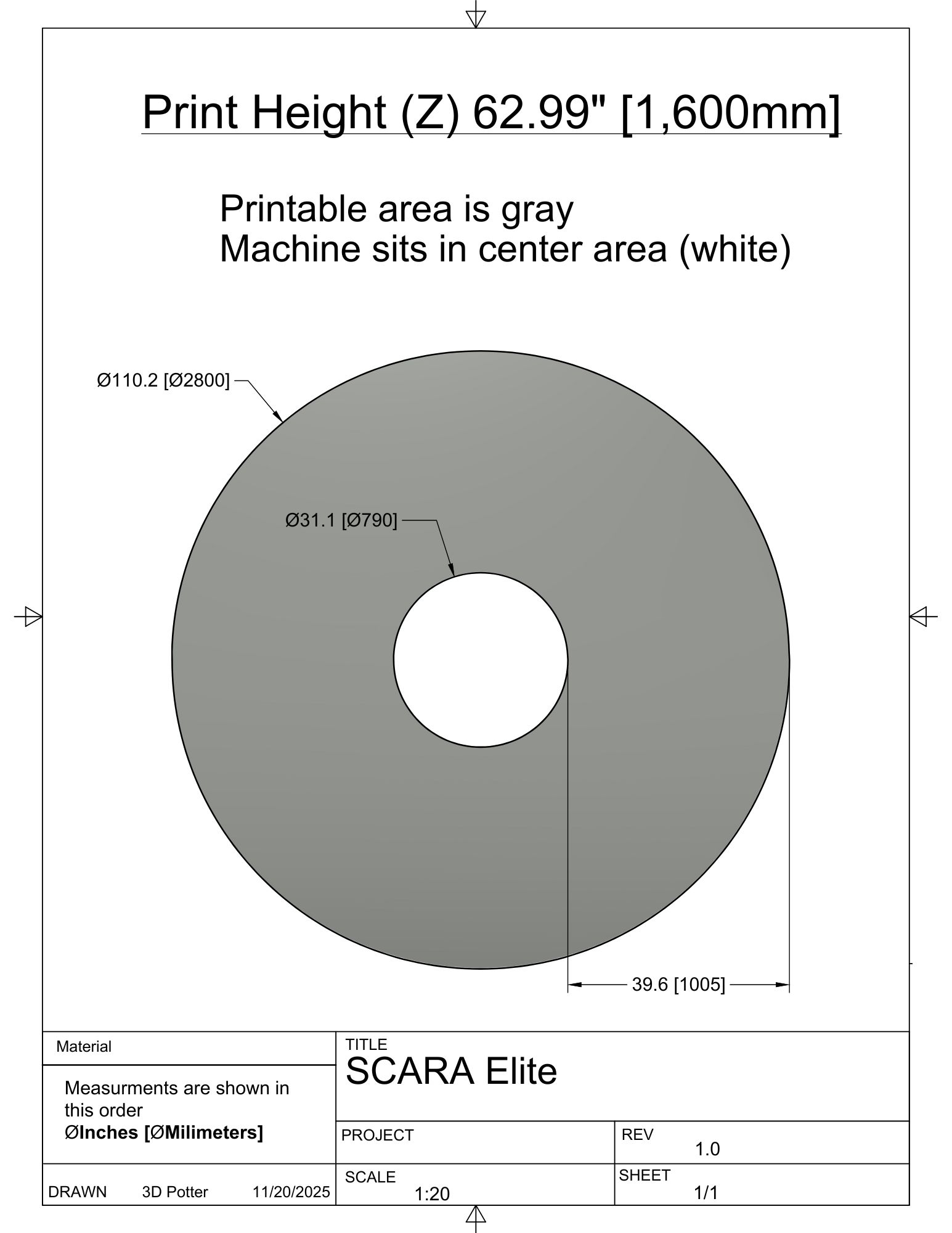 The SCARA Elite is capable of achieving high precision and accuracy through diligent design and robust construction techniques. The majority of this printer is crafted out of heavy Industrial grade cast aluminum utilizing CNC-manufactured components for maximum strength accuracy and rigidity. The main rail components are from IGUS* which is one of the leading German manufacturers of precision guide rails. The drive motors are Clearpath closed-loop servo motors (Not Stepper Motors). These have onboard computers with telemetry that continually update their position for zero error positioning. In addition to high-powered servo motors, the Scara Elite Utilizes sophisticated harmonic drive units. These are the same drives used on large industrial robots similar to the ones that are now in many large manufacturing facilities. These drives are extremely heavy-duty and capable of precision movement down to fractions of a degree. This means very precise prints with no backlash or jittery movements at realistic speeds. These drives are designed for maximum rigidity with extreme accuracy.