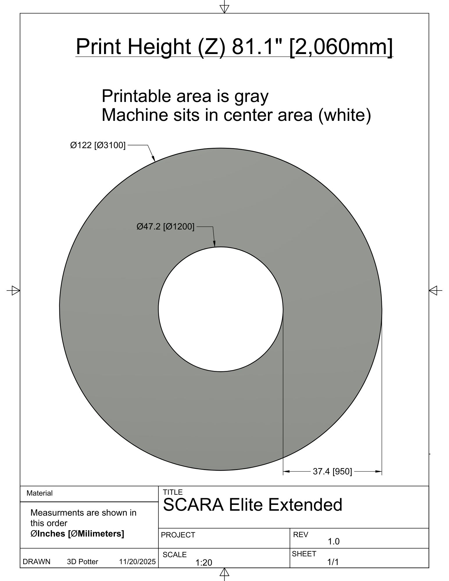 The Scara Elite is purpose-built for printing cementitious materials. Built with cement printing in mind, it comes with a distal arm fitted for a pump.